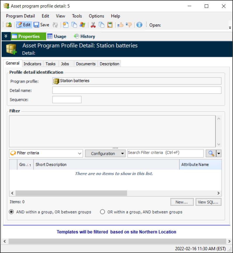 • Objects created directly from the profile’s task templates, job templates, and indicator templates display the source in their windows. For example, the Usage view in the Indicator window provides the Program Profiles tabTo Set up an Asset Program Profile