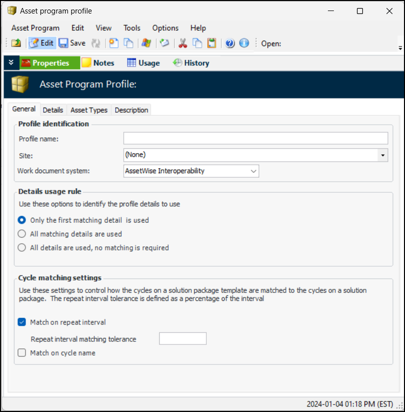 2. Click New. The Asset Program Profile window appears. This example is for the AssetWise Interoperability work document system:When the work document system is APM, the Cycle matching settings do not appear.