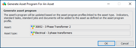 1. Open the Asset window, click the Tools menu and then Generate Asset Program. The Generate Asset Program for an Asset dialog appears. For example:Tip: To view the program profiles that will be applied to the asset, select the Reliability Program view and the Program Profiles tab. This tab lists profiles assigned to the asset type.