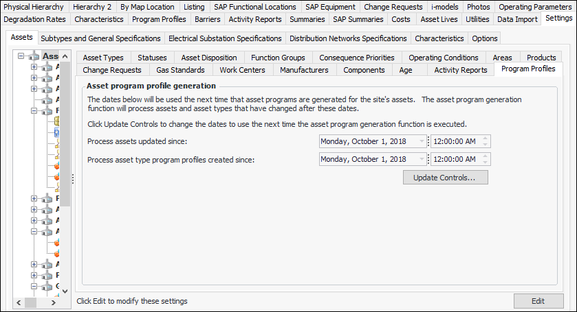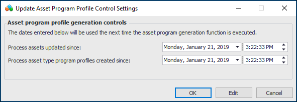 3. To change the dates, click Update Controls. The Update Asset Program Profile Control Settings dialog appears. For example: