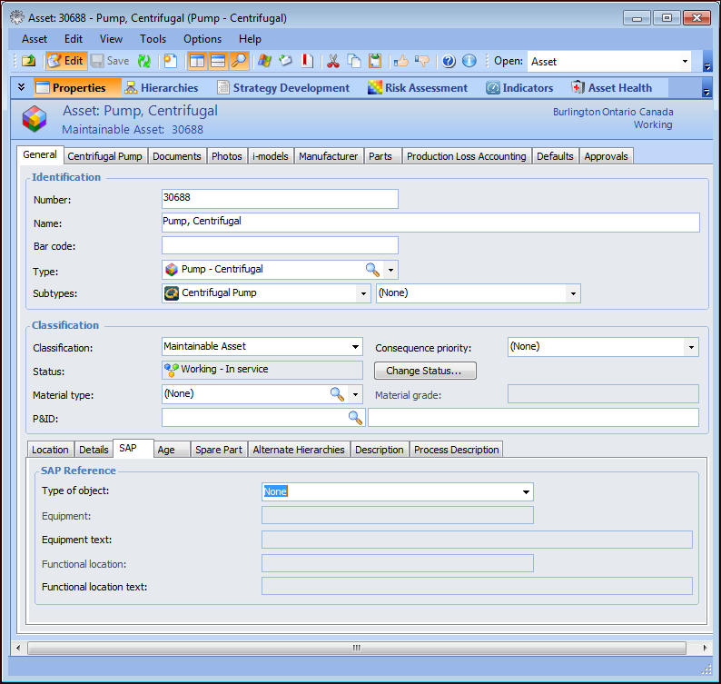 The SAP Properties view is added to the Asset window to display the SAP object’s properties. You can also open the Equipment or Functional Location window to view the