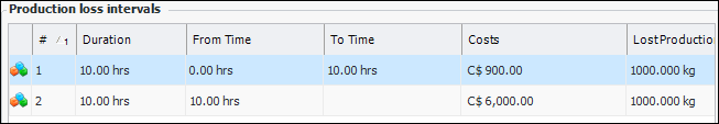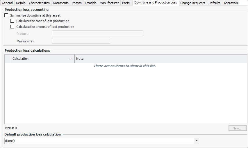 • Duration for costs: This is the period of time that the number of lost production units and lost monetary value are based on, for example, 8 hours.The Downtime and Production Loss tab is available on the Asset window only if the asset type allows production loss accounting rules to be defined on the asset. On this tab, you can select how the downtime costs for the asset are calculated. The asset type determines whether or not production loss rules can be entered, and whether or not downtime incidents can be reported on assets using that asset type.To Set Production Loss Rules on an Asset