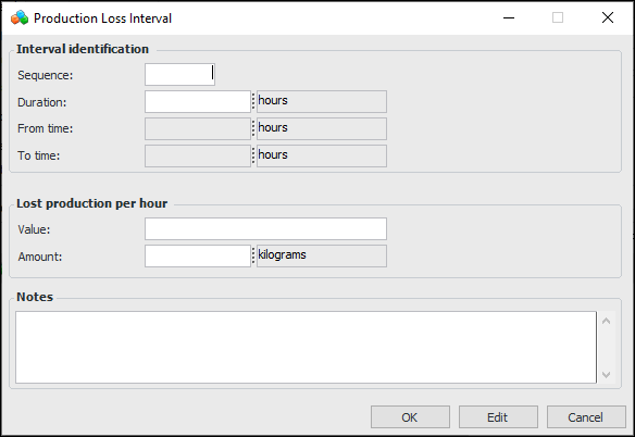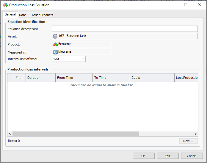 7. Click New to create a production loss interval. The Production Loss Interval dialog appears. In this example, the cost equation is for both monetary and production units.
