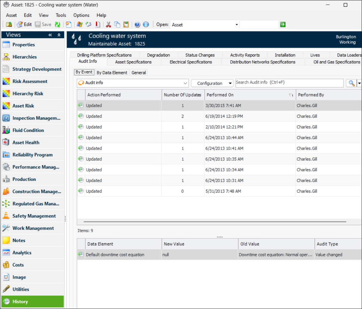 Tip: You can also view audit information at the site level for all assets. Select the Asset Management view and the Asset History tab.To View the Audit History of an Asset