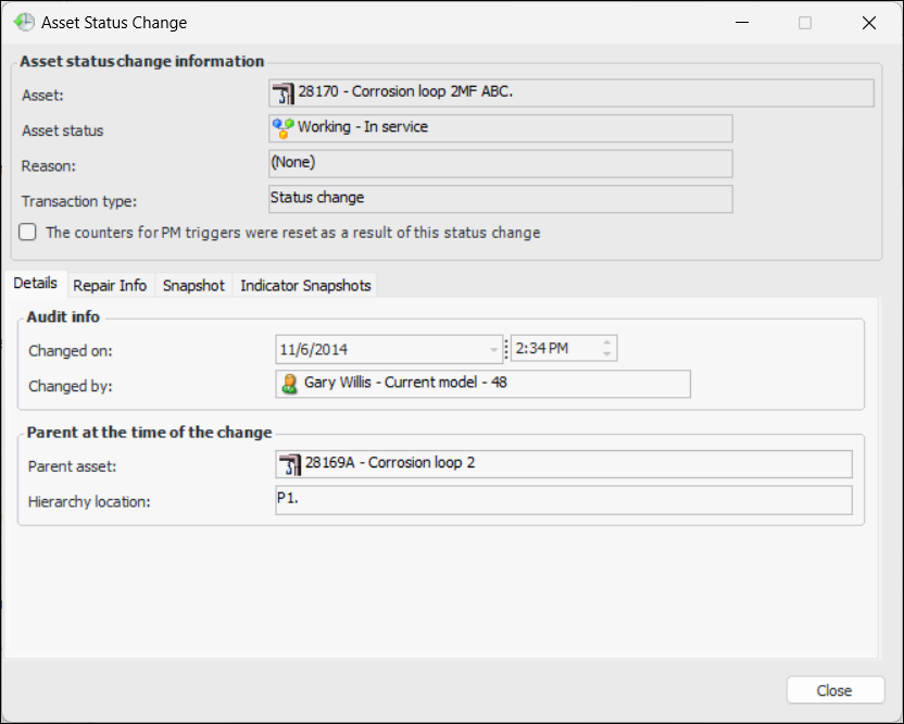 6. Select the Indicator Snapshots tab, if available, to view the life-to-date and asset life values of the asset’s cumulative indicators at the time that the status changed.