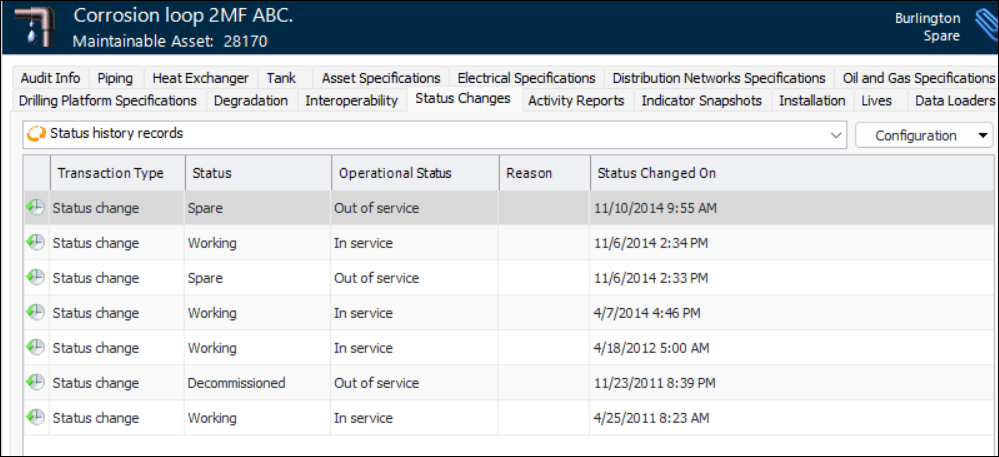 1. Open the asset and select the History view, and then the Status Changes tab. This tab shows a list of each status the asset has had, with the most recent changes at the top of the list. For example:If the asset is a component location, the Component installed in this location area displays the component installed when the status change occurred.If the asset is a component, the Component location area displays the location where it was installed when the status change took place. Information about the asset life is also shown. The Unit Details tab shows information about the inventory unit that the asset is linked to.