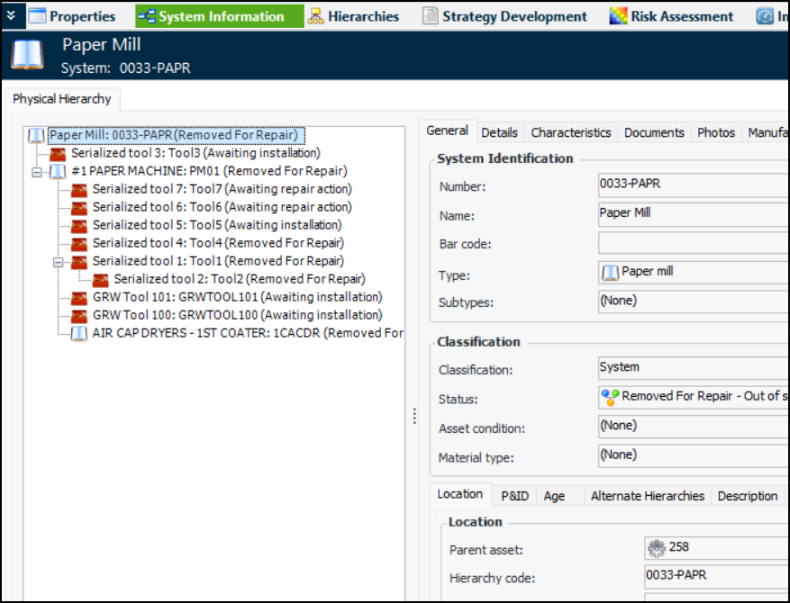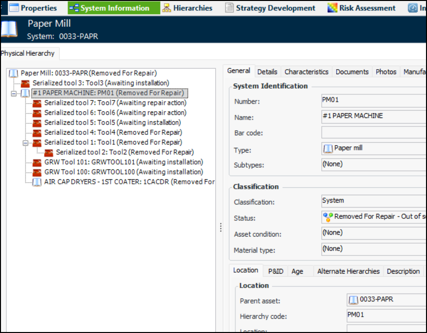2. Select the System Information view. The Physical Hierarchy tab displays a system hierarchy on the left and the properties of the selected asset, on the right. For example: