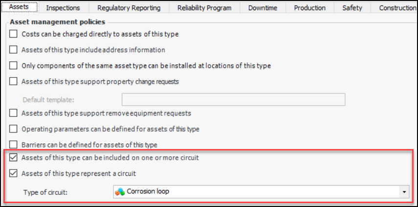 • Create or update asset types to support circuits. In the Asset Type window, select the Policies tab and then the Assets tab. In the Asset management policies area, click one or both circuit options. You can also select a circuit type. For example: