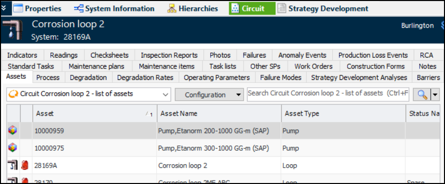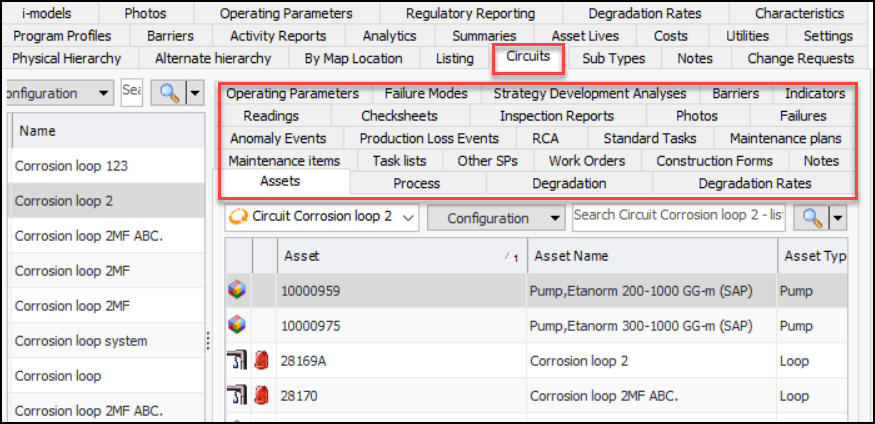 In the following example Site window, the Assets view, Circuits tab displays a list of circuit assets on the left. When an asset is selected (for example, Corrosion loop 2), the right-hand panel displays information about the member assets. The tabs range from the assets themselves to the failures assigned to the member assets.In an Asset window, the Circuit view is only available on assets that represent circuits. In this example for Corrosion Loop 2, the Circuit view displays the member assets and their information, including references to as many as 10 circuits.Strategy Development Analysis windows also display the Circuit view when the primary asset on the analysis represents a circuit.To Include an Asset in a Circuit