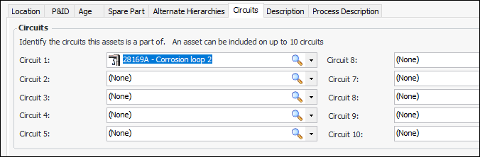 2. Select the Circuits tab. Browse for one or more circuits. Circuit references can be set on any asset in any order. An asset can be referenced more than once on the same circuit. For example, Corrosion Loop 2 could be assigned as the asset’s first and third circuit. The only restrictions are that the assets must belong to the same site and their asset types must allow them to be part of a circuit, represent a circuit, or both.Setting up APM to Support Circuits