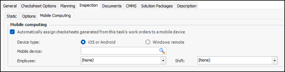 In a mobile device’s properties in APM, you can specify when automatic checksheet activities are downloaded. For more information, see Working with Mobile Computers in APM.Note: Bar code scanning based on standard tasks is available for technology preview. You must first enable feature 128 to use the functionality in APM. In the Enterprise window, select the Features view and the Enabled Features tab. Click Browse, select “Enforce indicator bar code scanning based on the standard task” and click OK. If APM is running as a smart client, click Refresh Enabled Features on the server. Then restart the client to use the functionality.Once you add an indicator to the standard task, the Mobile Computing tab becomes available in the Inspection tab of the Standard Task window.To Set Mobile Computing Options