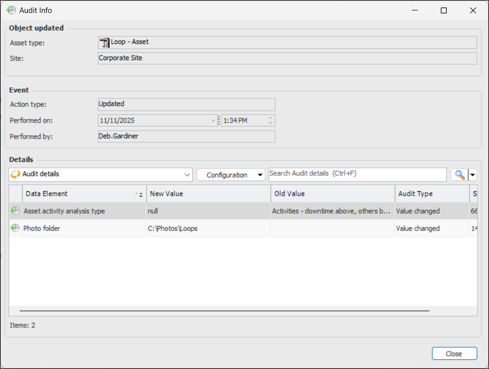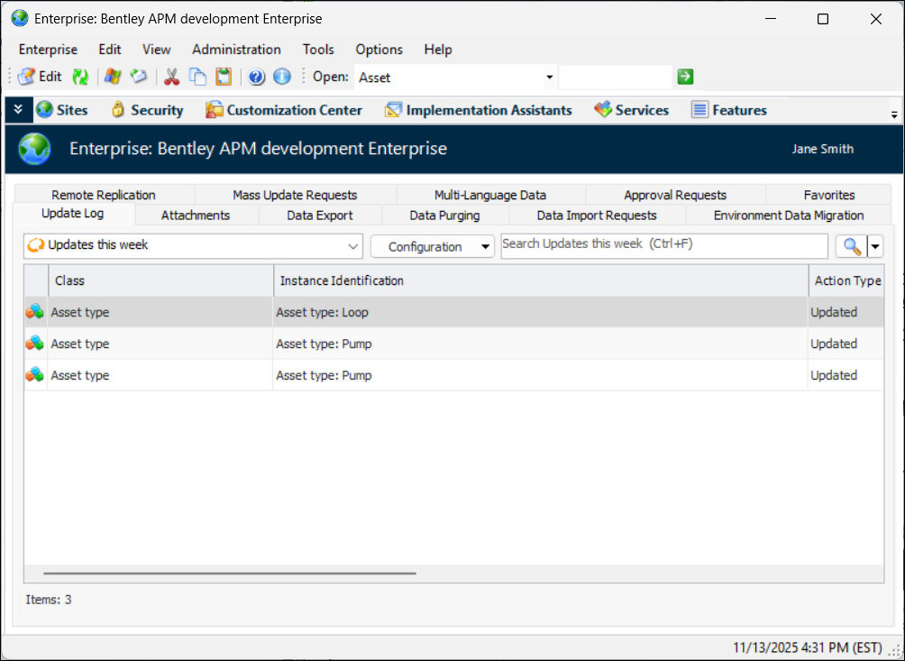 List of Updated Objects APM maintains a list (audit log) of objects that have been added to, updated in, and deleted from the APM database, including main objects (assets, indicators, standard tasks, checksheets, indicator readings, and so on), EAM objects (such as work orders, work order tasks, suppliers, and purchase orders), subordinate objects (standard task indicators, work order task requirements, PO lines, and so on), and value lists. To view this list, open the Enterprise window, select the Data Management view and the Update Log tab. For example: The default configuration lists updates that you have made in the last week. Several configurations are available, most of which show objects that you have created, deleted, or updated in the past week. However, you can select “All updates” and the filter or sort the list by user, action, or date. Double-click an item in a list to view its audit information. For example:
