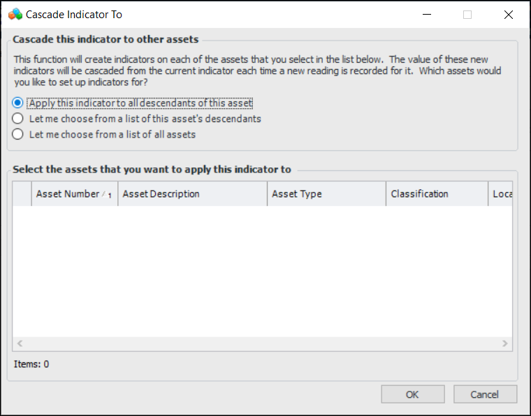 • Apply this indicator to all descendants of this asset: automatically applies the cascade to all children of the asset.