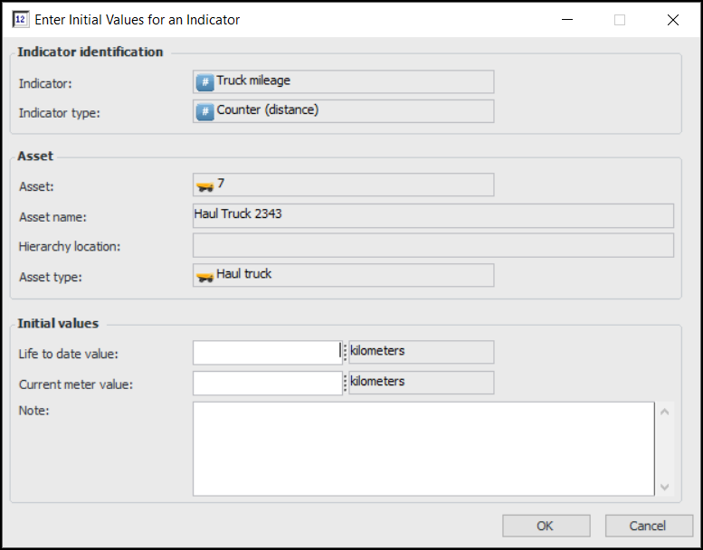 Enter the total value for the current life of the asset. For example, if the indicator is an odometer and the vehicle has travelled a total of 14,000 miles, enter 14,000. If you enter a number in the Current meter value box, you must also enter a value in this box.