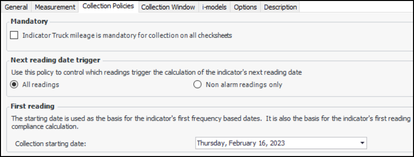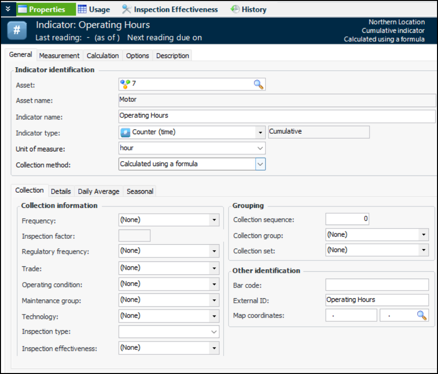8. On the Collection tab, you can enter values that determine how often readings are expected and the next collection date. You can also enter information to make it easier to select this indicator when adding indicators to a work order task or standard task, when copying indicators to another asset, when setting up dynamic inspection routes, or when implementing reliability programs.