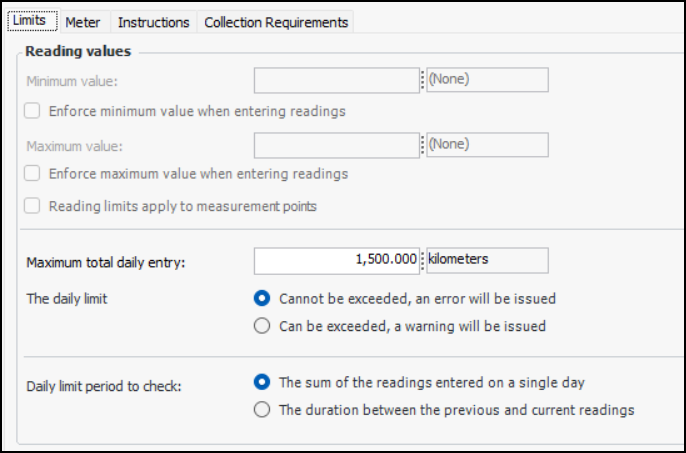 13. If necessary, you can enter a Maximum total daily entry on the Limits tab for the indicator. This is the maximum total amount that can be entered in one day for this indicator. For example:Using the Daily limit period to check option, you can also specify whether the sum of the readings entered on a single day are considered or if the duration between the previous and current readings are considered when evaluating the maximum daily entry.To Enter Initial Values