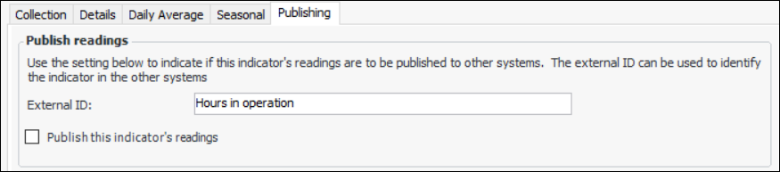 29. If the indicator type supports publishing indicator readings to an external system, the Publishing tab is available. Select this tab if you wish to publish processed readings for the indicator.