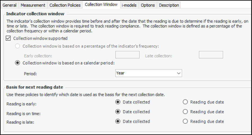 • Collection window is based on a percentage of the indicator’s frequency – Enter percentages in the Early collection and Late collection boxes.Note: This option is not available if a frequency has not been selected on the General tab, Collection tab.
