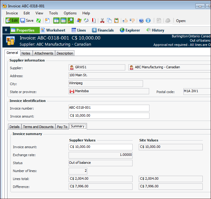 4. On the Properties view, select the General tab, and then the Summary tab. This tab displays the status of the invoice and the difference, if any.