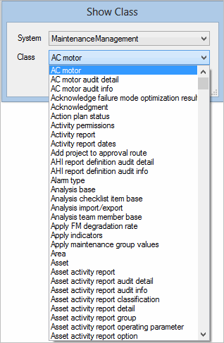 6. Select a system from the list. All APM classes for the selected system are available. For example, the MaintenanceManagement system includes classes relating to asset maintenance: