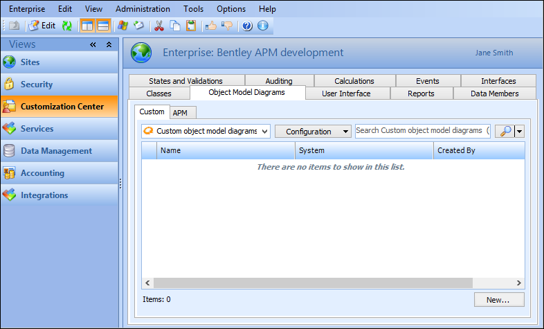 You must be logged in with APM administrator rights in order to access the Customization Center view and object model diagrams.To Create an Object Model Diagram