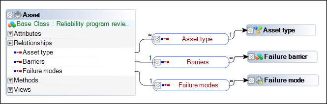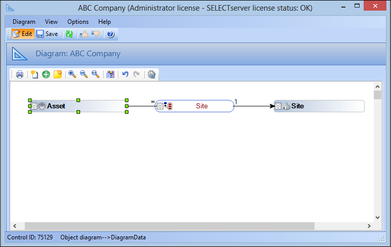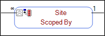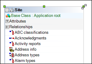 8. Right-click the class and select Relationships, then Show, and then select a relationship from the list. For example, select the Site relationship. The relationship is displayed on the diagram:Tip: From a class, you can expand its components and then expand the Relationships header to display all relationships in the class. For some classes, the list of relationships are extensive, therefore after all necessary relationships are displayed on the diagram, you can right-click Relationships in the class box and choose Only Show Drawn Relationships to toggle the list from showing all to only drawn relationships. For example: