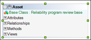 9. Right-click the class header and select Show Inherited Members to show attributes, relationships, methods, and views that are inherited from the base class. These members appear in green. For example: