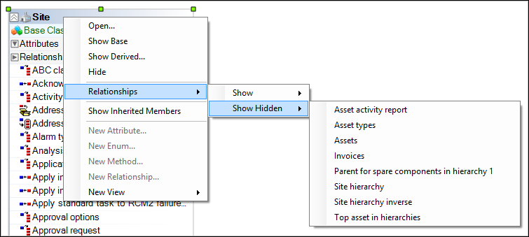 3. To show a hidden relationship, right-click the class header and select Relationships, then Show Hidden, then select a class from the list. For example: