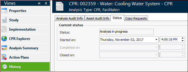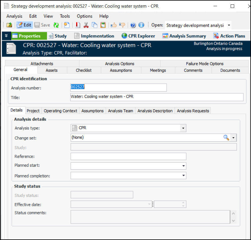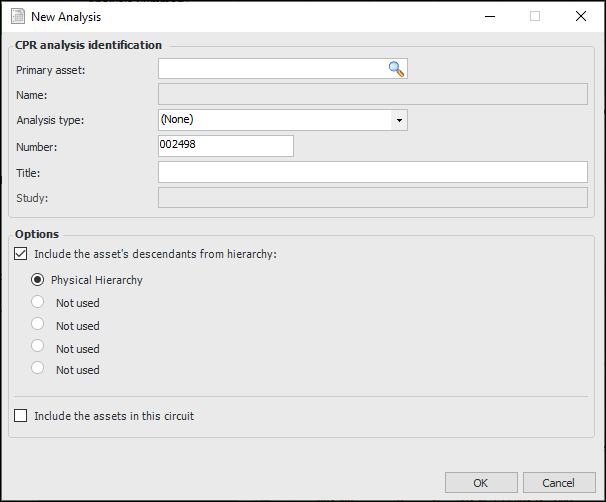 2. Click New. The New Analysis dialog appears.Tip: You can also create a review by opening an asset and selecting the Strategy Development view. On the Strategy Development tab, select the Analyses tab. Click the New list and then CPR. The New Analysis dialog appears, and the primary asset information is filled in.