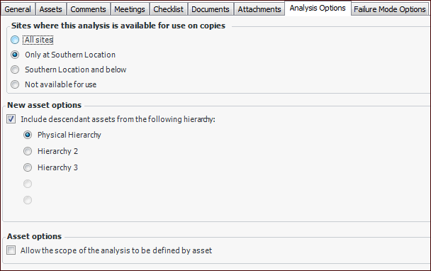 28. The New asset options area shows the settings you selected on the New Analysis dialog when creating the analysis. If you intend to add assets, you can select a different hierarchy.On the Assets tab, you can provide a description of the scope covered by the analysis. The same asset can be added to the analysis as many times as required. For more information, see Working with Asset Scope on a Current Practice Review.