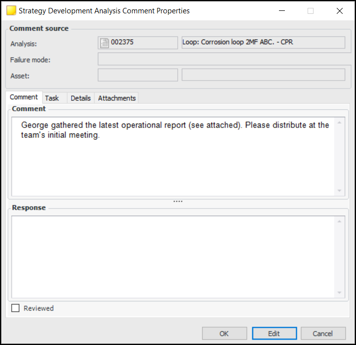 2. Click Edit to modify the comment, add a response, or mark the comment as reviewed. You can also add attachments and view details about the comment’s history.