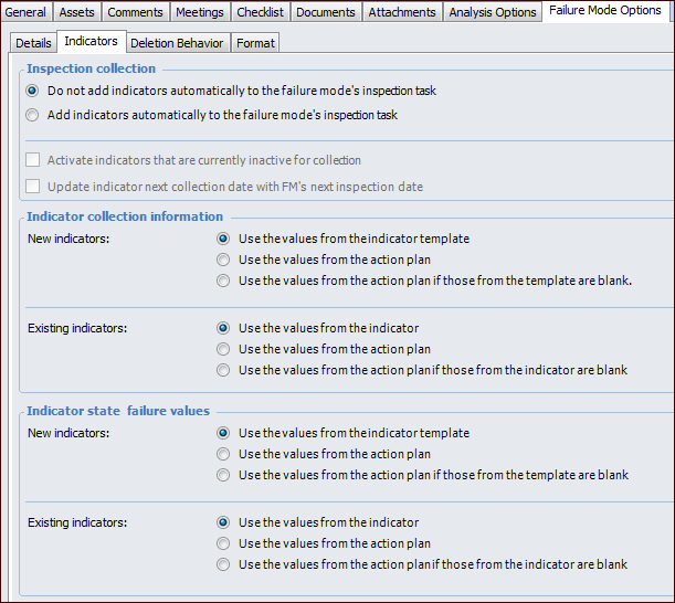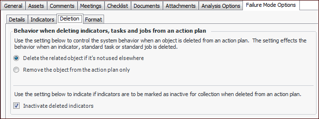 • Add indicators automatically – when an inspection task is added, indicators currently on the action plan are added to the standard task. When indicators are subsequently added to the action plan, they are automatically added to the standard task.To enable this functionality, select Activate indicators that are currently inactive for collection.To Set Deletion Behavior Options