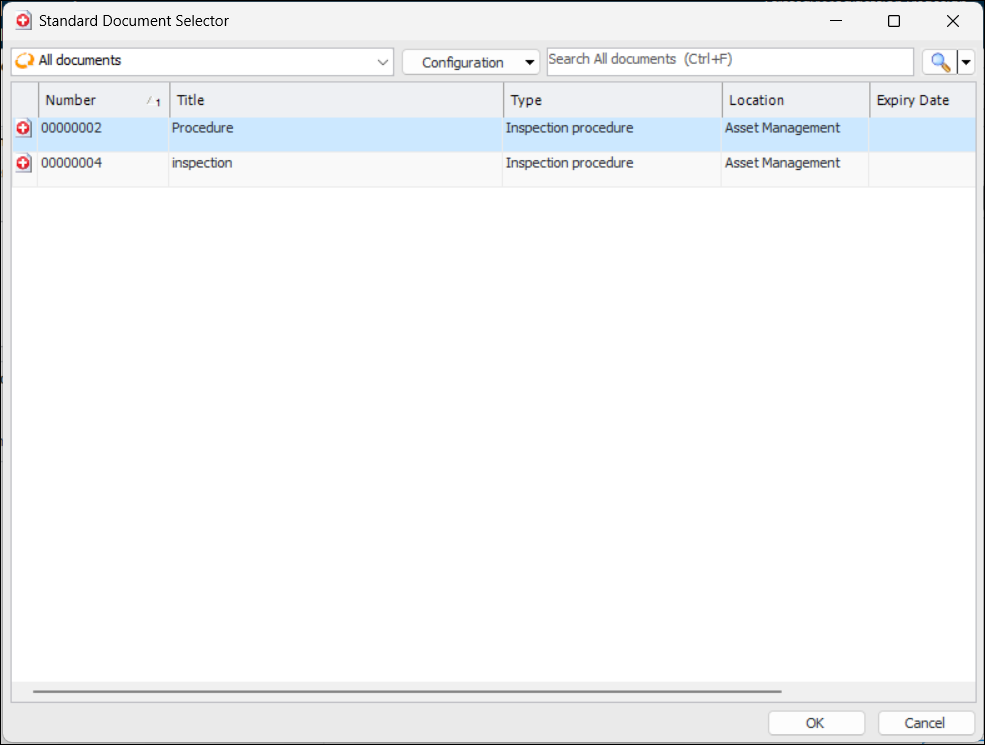 Concepts Tasks Settings Adding Standard Documents to CPR Action Plans Any primary or secondary action plan that recommends modification/redesign of the asset can have one or more standard documents assigned to it. For example, if a one-time modification is to train trades people to perform a new task, you can attach a standard document that describes the training prerequisites, objectives, and evaluation methods. Note: For information about adding documents to APM, see Creating a Standard Document. To Link a Standard Document to a Modification 1. Open the Maintenance Action Plan window. 2. Make sure that editing is enabled. 3. Select the Failure Mode view and the appropriate Action Plan tab. Note: The recommended task type must be Modification/redesign if you wish to assign a standard document to it. 4. On the Modifications tab, click Browse. The Standard Document Selector dialog appears. For example: 5. Select a document. 6. Click OK in the selector dialog. The document is added to the Modifications tab.