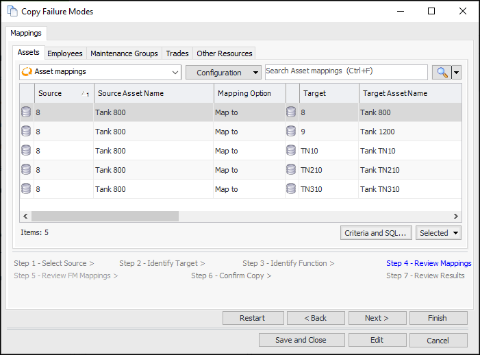 9. Click Next. The wizard matches objects as needed and presents the mappings for your review. For example:Tip: To view information about a source object on any of the mapping tabs, right-click it and click Source. For example, the Source dialog that appears for an asset mapping contains tabs for the asset’s failure modes, indicators, work order tasks, jobs, and job tasks, as well as the corrective tasks, jobs, and job tasks for the indicators. You can also view information about any secondary action plans included in the failure modes.The Suggestion Origin column displays the method used for matching. The options are: