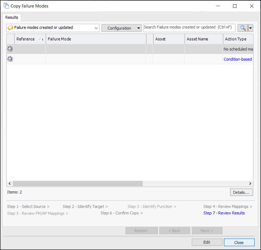 16. Check the items that will be created or updated. If an incorrect copy request is processed, you will have to make the corrections manually. Click View to see more details about the items.The Failure Modes tab shows information about the source failure modes. If you wish to remove a failure mode from the list, right-click it and click Remove. Click Back to make adjustments on previous pages.