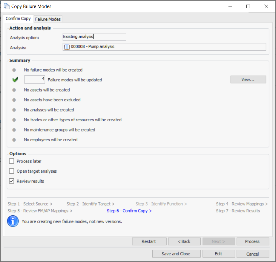 • Create new – a copy of the failure mode is created when the copy request is processed