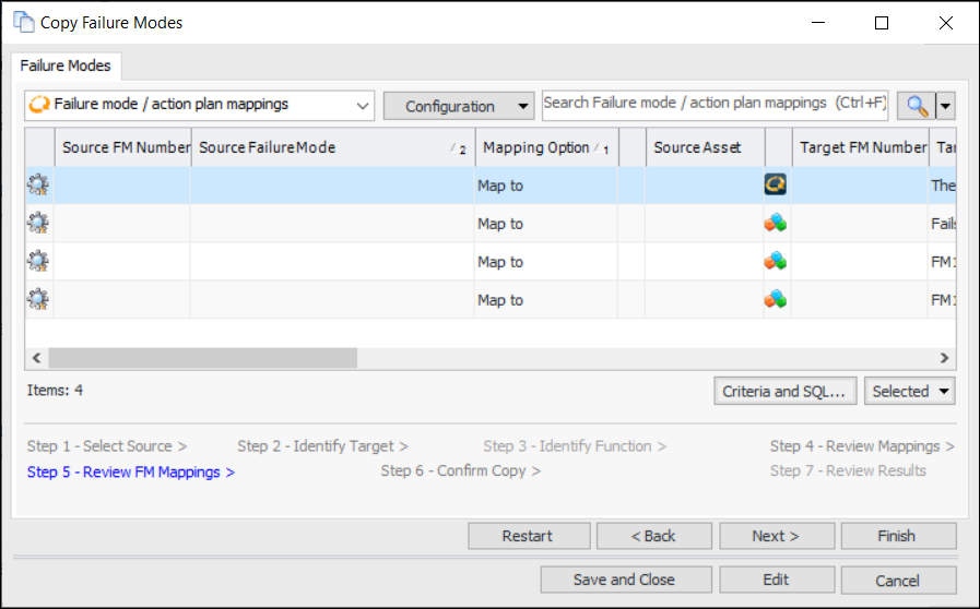 14. Click Next. If you are updating existing failure modes, the Review FM Mappings step appears.Review the mappings before proceeding. To change a mapping, right-click it, click Mark As, and click one of the options:
