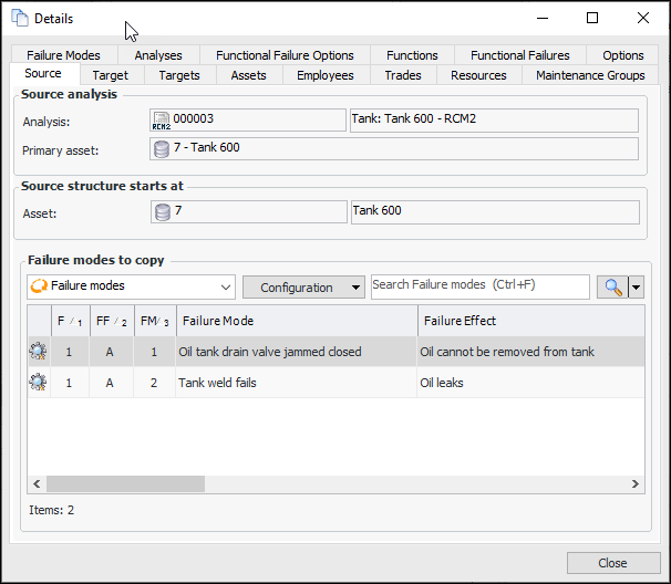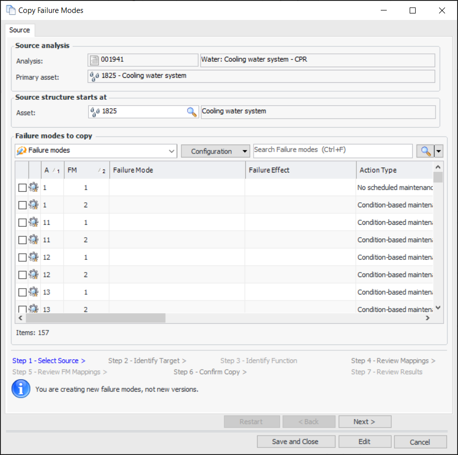 1. From the site’s Strategy Development view and tab, select the appropriate tab. If you wish to copy a template’s failure modes, select the appropriate table configuration.Note: You can also open the analysis or template, click the Tools menu, Failure Modes, and then Copy To. You can also click the Analysis menu, Create, and then Copy.When the source is a template, the Primary asset box displays the asset type and Source structure starts at is not available.Tip: You can also copy individual failure modes or action plans from the current analysis or template to another one. Right-click the failure mode or action plan in a table and click Copy To. The Copy Failure Mode wizard appears, displaying the single failure mode in the Select Source page.