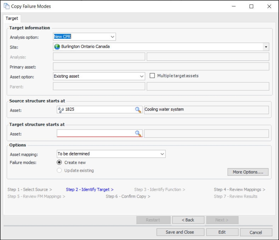 3. All of the source failure modes are selected by default. Clear any that you do not wish to copy and click Next. The Target step appears. This example shows the Target step when the source is an analysis:If the source is a template, the Asset option box is set to “Existing asset”.