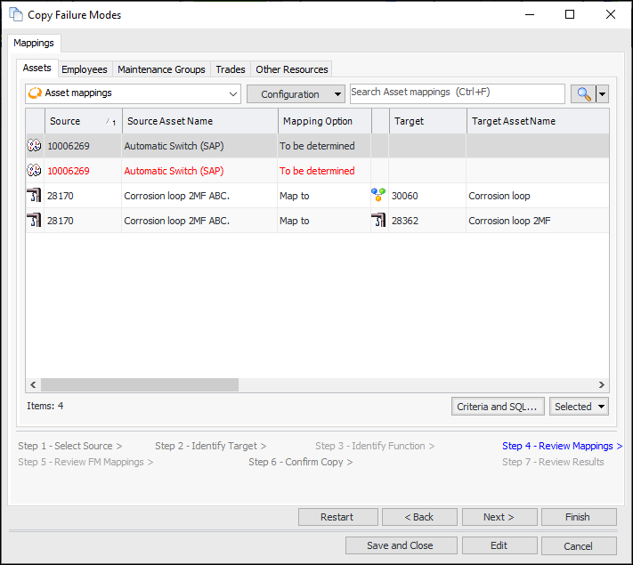 • To Be Determined – you can select the mapping option laterFor employees, trades, and maintenance groups, the Mark as options are New, Same As Source, and To Be Determined.Note: If a mapping is marked as To be determined, the copy request cannot be processed. However, you can save and close it until you decide what to do with it. You can then re-open the request from a Copy Requests tab and finish defining and processing it. For more information, see Revisiting CPR Failure Mode Copy Requests.