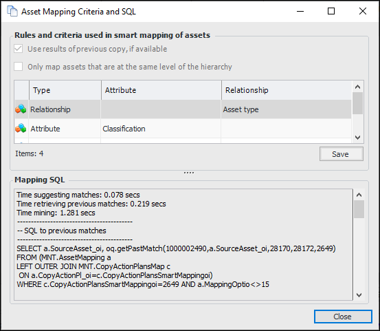 12. To view more information about the matching process, click Criteria and SQL. The Asset Mapping Criteria and SQL window appears. For example: