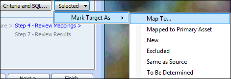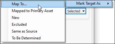 13. To make adjustments to a mapping, select it in the Asset mappings table, click Selected, Mark Target As, and one of the options. Here is an example of the list for asset mappings: