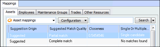 10. Click Next. The wizard matches objects as needed and presents the mappings for your review. For example:If the source is a template, the Assets tab is not displayed. This step provides tabs listing employee, trade and service, maintenance group, and other resource mappings.Tip: To view information about a source object on any of the mapping tabs, right-click it and click Source. For example, the Source dialog that appears for an asset mapping contains tabs for the asset’s failure modes, indicators, work order tasks, jobs, and job tasks, as well as the corrective tasks, jobs, and job tasks for the indicators. You can also view information about any secondary action plans included in the failure modes.The Suggestion Origin column displays the method used for matching. The options are: