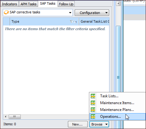 In primary and secondary action plans, you can select an SAP task list, maintenance item, or maintenance plan for corrective tasks. This example of the Maintenance Action Plan window shows both APM Tasks and SAP Tasks tabs because the site’s profile makes information from both systems available.In the action plan’s Details area, SAP information (System condition and Work center) can replace APM information (Operating condition and Maintenance group).For information about viewing, filtering, and browsing SAP objects, see Viewing SAP Plant Maintenance Data in APM.For information about setting up interoperability, see APM Interoperability Guide for SAP Plant Maintenance.