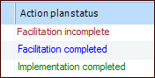You can keep track of the strategy development process by monitoring the status of reviews and action plans. For example, select the site’s Strategy Development view, CPR tab. Scroll to the Analysis status column:To view the statuses of action plans, open the review, select the Facilitation view and then the Action Plans tab. Scroll to the right to see the Action plan status column. For example: