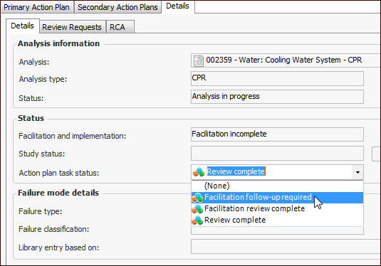 2. Select the Details tabs.Tip: To assign a task status to a secondary action plan, select the Implementation view in the Maintenance Action Plan window. Select the Secondary Action Plans tab. Double-click the action plan to open its Maintenance Action Plan window. Select the Details tab.