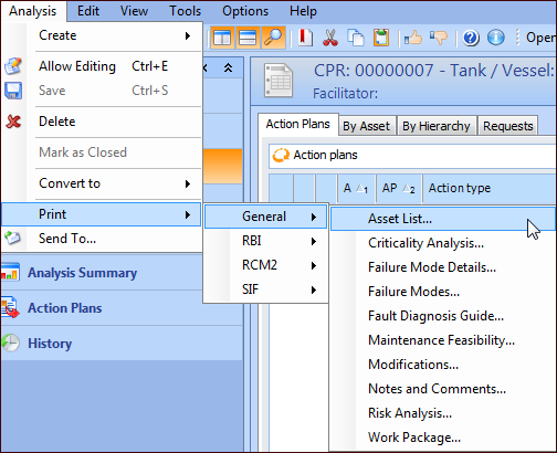 2. In the Strategy Development Analysis window, click the Analysis menu, Print, General, and then the report you’d like to print.Tip: You can also print an action plan’s details report. Open the Maintenance Action Plan window, click the Failure mode menu, Print, and then Failure Mode Details.
