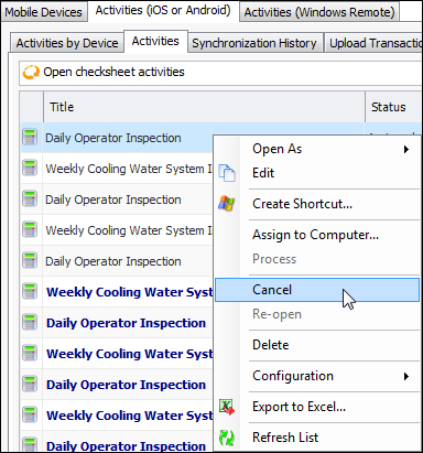 3. A confirmation message appears. Click Yes. The system changes the status of the activity to “Canceled”. The item is scored through in the table.To Uncancel a Canceled Mobile Activity