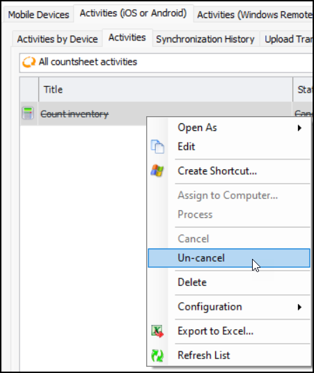 2. Right-click the canceled item and click Un-cancel.