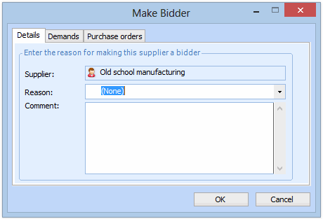 5. If you are changing a supplier to a non-ordering or bidding supplier, the dialog also displays Demands and Purchase Orders tabs.Select the Demands tab. This tab shows any outstanding purchase demands on which this supplier is listed as the preferred supplier. If you are making the supplier a non-ordering supplier, the system clears the preferred supplier setting on these demands.